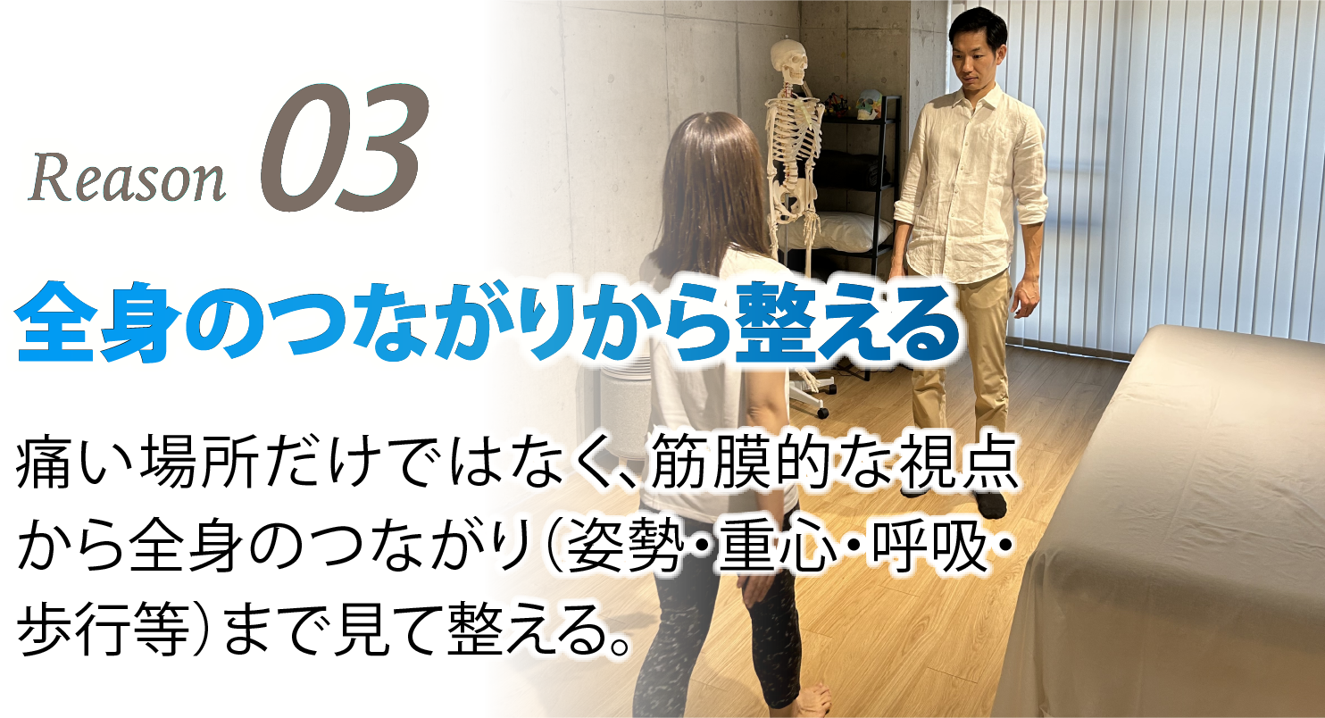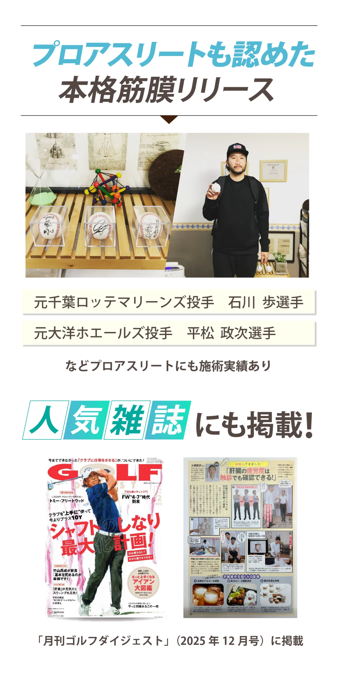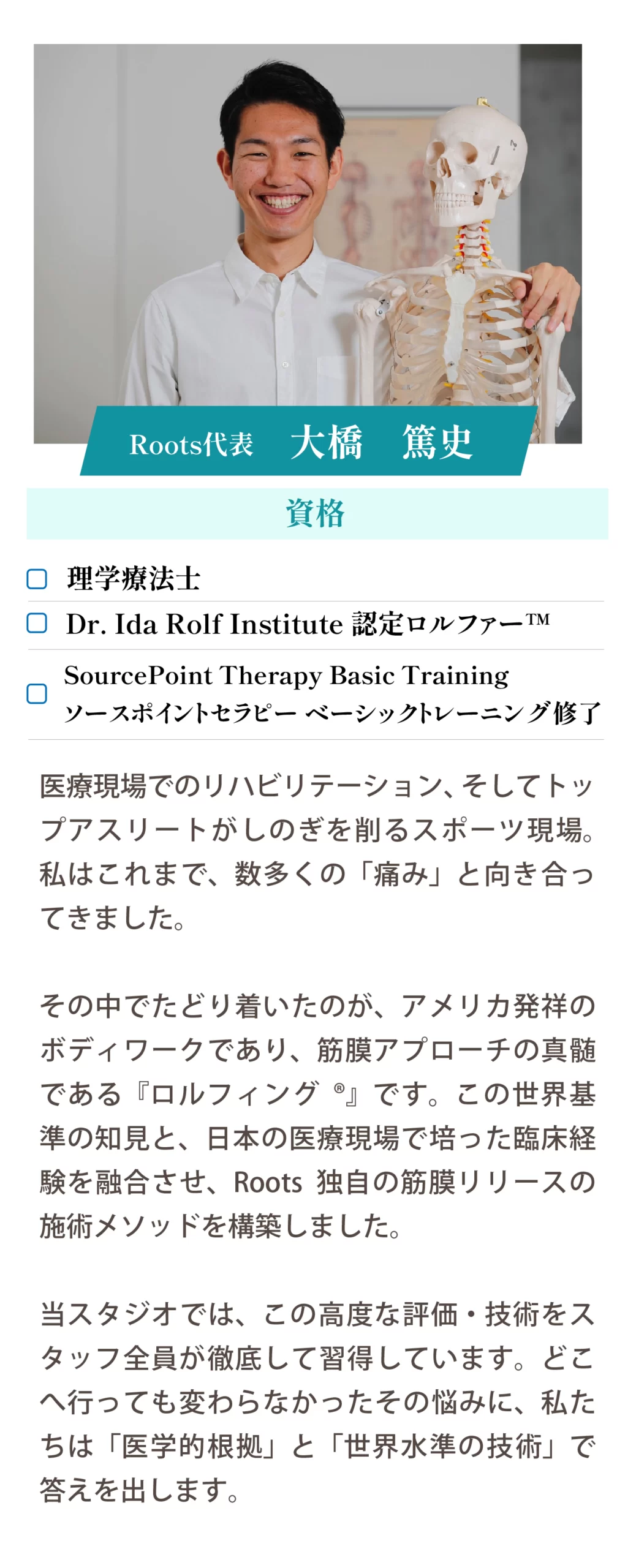 単に筋肉を揉みほぐすのではなく、ロルフィングの理論に基づき「全身のつながり」を整えることで、重力に対して最も楽で自然な姿勢へと導きます。 プロの知見を活かした「本物の筋膜ケア」で、痛みや不調の出にくい身体作りをサポートします。