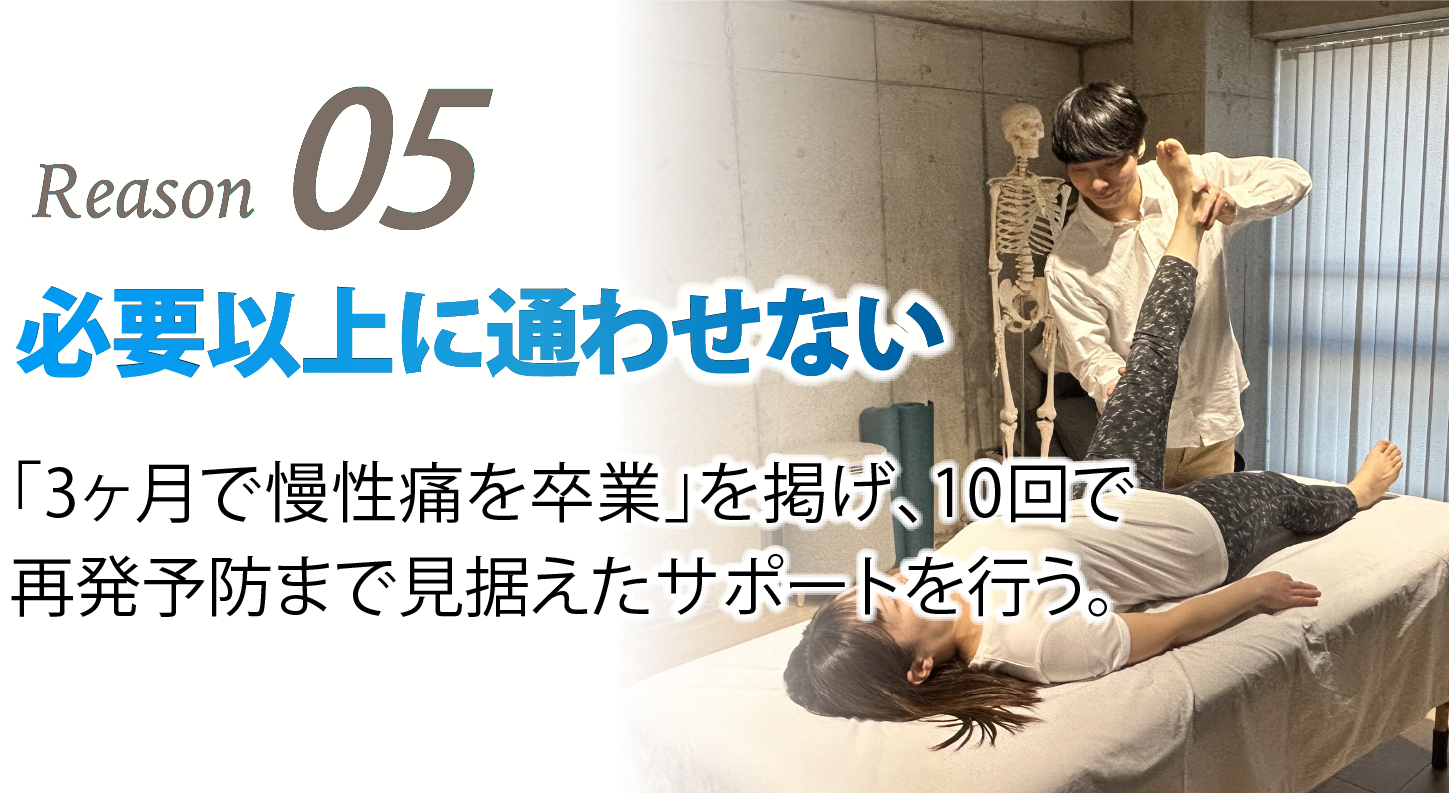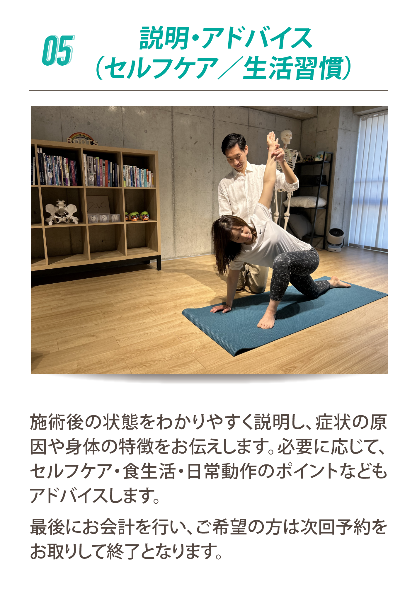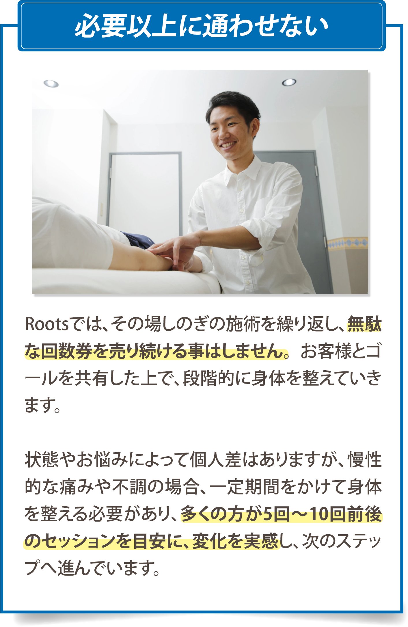 特に長年続いている痛みや不調の場合は、前半5回で改善を目指し、後半で安定させていくなど、複数回の施術を通して整えていくことで、より良い結果につながることが多いです。 ※症状の改善には個人差があり、効果を保証するものではありません。